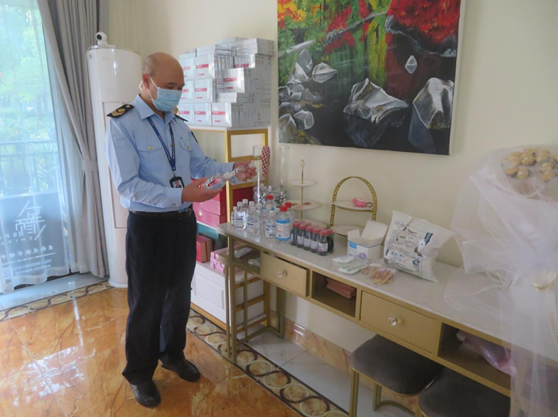 近日,市衛(wèi)生監(jiān)督所接群眾投訴舉報(bào),有人在某住宅小區(qū)開展針劑注射的醫(yī)療美容服務(wù),懷疑存在非法醫(yī)美行為,我所立即派出執(zhí)法人員到場(chǎng)開展檢查。經(jīng)核查,該地址為鶴山碧桂園天匯小區(qū)一居民住宅,大門口沒有懸掛招牌,大門口正上方、右側(cè)懸掛“祛斑、祛痰、祛黃、紋繡”的廣告,正前方懸掛有“美白祛斑”“無痕雙眼皮”“45°翹睫芭比眼”“媚眼術(shù)”等醫(yī)療美容廣告,在該場(chǎng)所內(nèi)查見稀洛因精華素、沒有中文標(biāo)識(shí)的美容產(chǎn)品、“嗨體”美容產(chǎn)品、已使用的針頭一批和顧客登記本等物品。